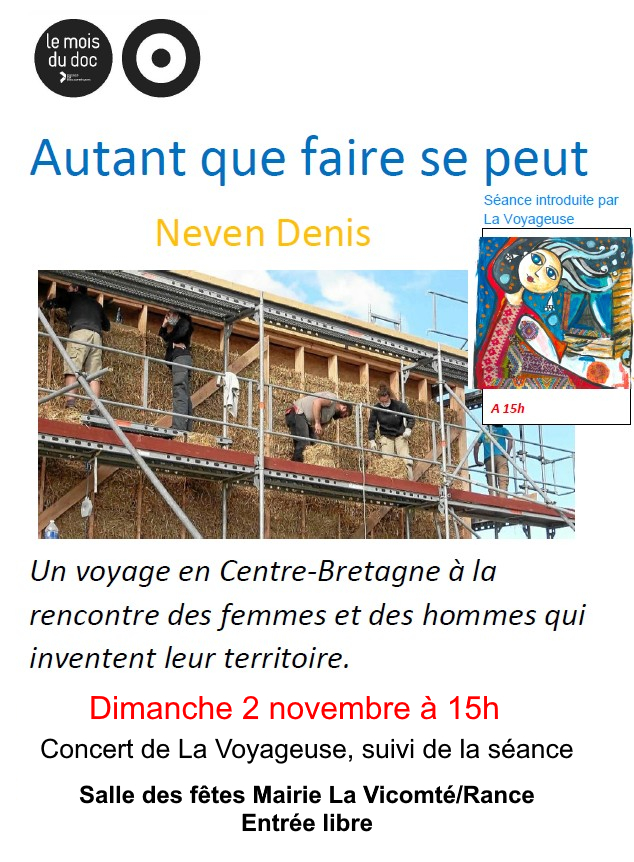 Salle des Fêtes - La Vicomté sur Rance 22 rue de la mairie, La Vicomté sur Rance, FranceConcert de La Voyageuse à 15h, suivi à 16h du film Autant que faire se peut de Denis Neven présenté dans le cadre du Mois du Doc. Entrée libre.